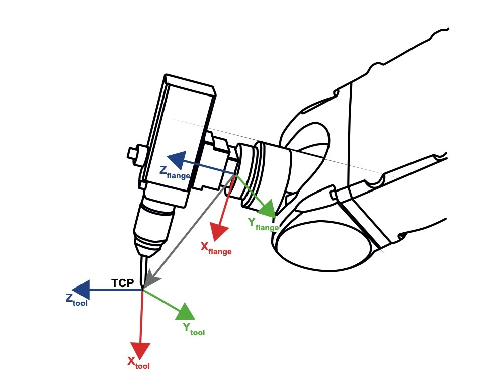 TCP je definiran glede na prirobnico robota (glej sliko 2). Koordinate orodja se lahko vnesejo neposredno numerično ali pa se izmerijo s kalibracijsko metodo. Pri programiranju aplikacije se uporablja koordinatni sistem orodja. Če se orodje spremeni, se TCP preprosto prilagodi, ta sprememba pa se nato upošteva v vseh robotskih programih gibanja, kjer se to orodje uporablja.