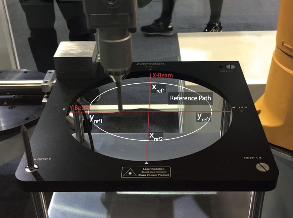 Ker ima orodje premer, večji od nič, se laserski žarek med prehodom orodja prekine. »Sredina« prekinitve svetlobe, ki izhaja iz padajočega in naraščajočega roba svetlobnega signala merilnika TCP, predstavlja želeno referenčno točko orodja x-ref in y-ref.