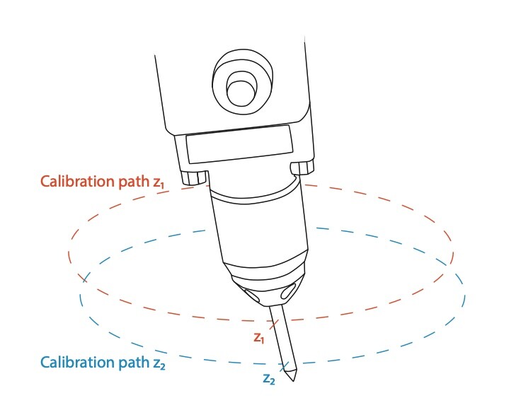 Za korekcijo nagnjenega orodja, npr. upognjene varilne konice, se kalibracijski pomiki robota izvedejo z dvema krožnima giboma na različnih višinah z1 in z2 (glej sliko 4). Vsaka prekinitev laserskih žarkov v osi x in y določi korekcijske položaje x-cal1, x-cal2 ter y-cal1, y-cal2. Iz odstopanj TCP med obema re-kalibracijskima potema je nato mogoče izračunati in korigirati kot nagiba α.