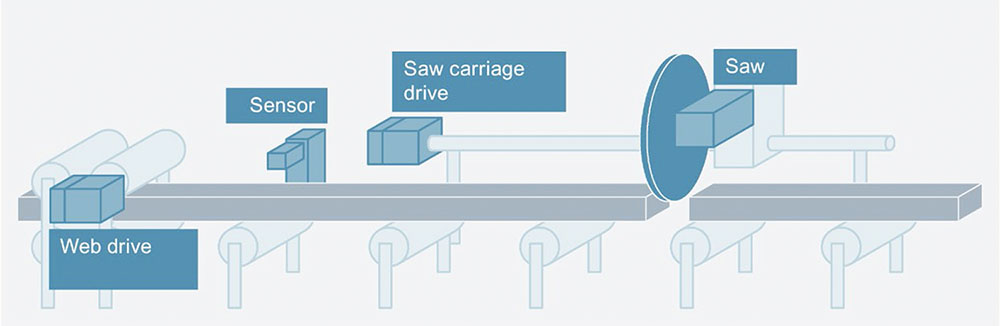 Funkcijski bloki, za razrez z letečo žago ''Flying Saw'' za kontinuirani gibajoči tok materiala (npr. folija, kovina, papir, jekleni profili itd.), omogočajo, da se material razreže med gibanjem s SIMATIC S7-1500T.