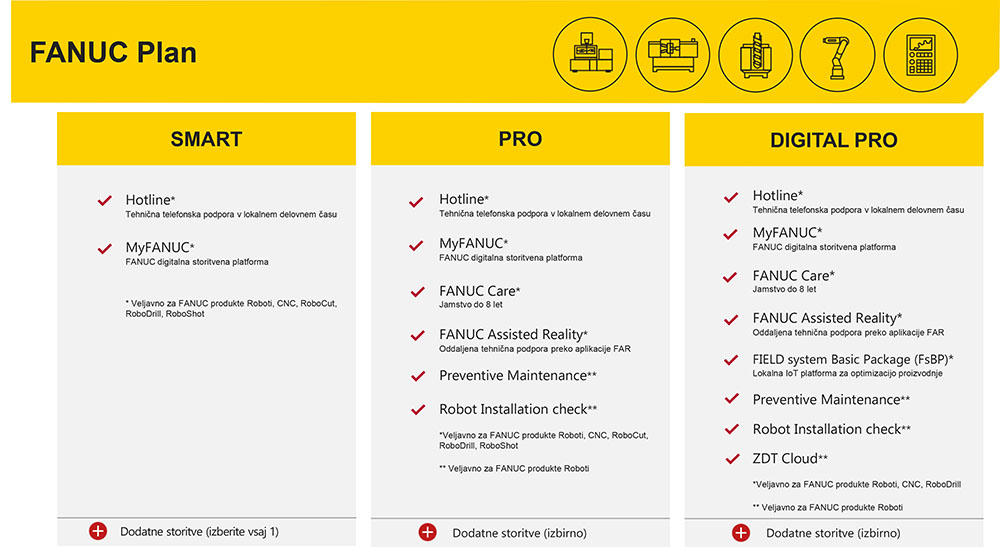 FANUC PLAN zajemajo oz. predstavljajo prilagodljive servisne pakete, zasnovane za zagotavljanje optimalne učinkovitosti in visoke razpoložljivosti FANUC robotov in strojev ter CNC krmilnikov skozi celoten življenjski cikel opreme. Servisni paketi uporabnikom zagotavljajo fiksne in predvidljive stroške vzdrževanja, omogočajo lokalno in hitro tehnično podporo, nudijo do 8 letno jamstvo – FANUC Care ter vključujejo možnost nadgradnje s prilagojenimi dodatnimi storitvami. Na voljo so 3 servisni paketi, glej tabelo.