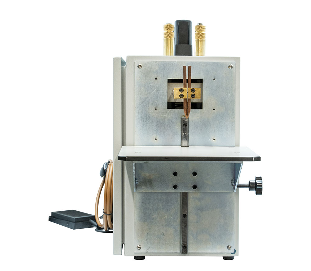 Druga pomembna značilnost je brezstopenjsko nastavljiva višina delovne mize, nameščena na natančnih krogličnih drsnikih, ki omogoča hitro in natančno poravnavo obdelovanca. V kombinaciji z nastavljivim razmikom med elektrodami (3–12 mm) in prosto nastavljenim kotom elektrode lahko upravljavec doseže optimalno pozicioniranje za vsako uporabo. Zaradi enostavnega pozicioniranja in nastavljivosti varilnih parametrov lahko sistem enostavno prilagodimo za varjenje različnih baterij.