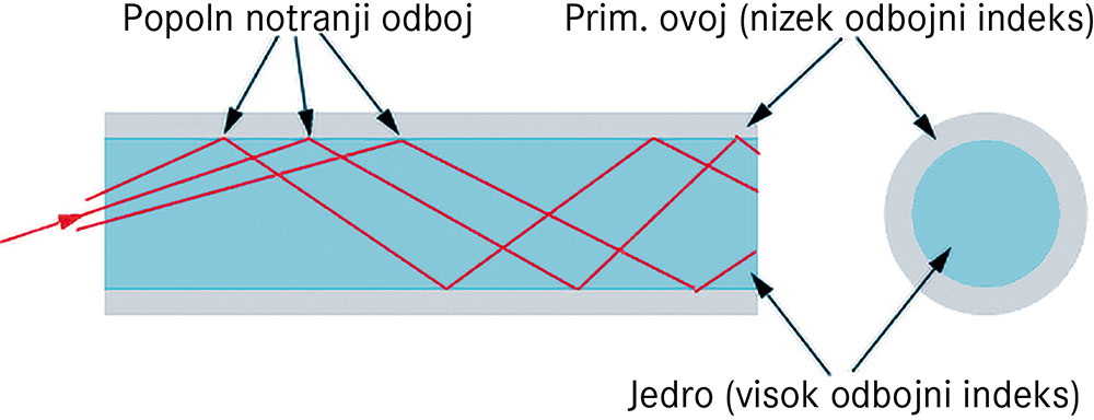 PRIMARNI OVOJ (Cladding): Plast okoli jedra z nižjim lomnim količnikom, ki omogoča popoln notranji odboj svetlobe.