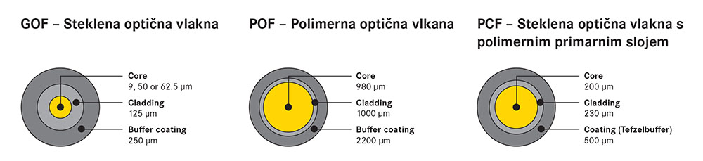 ZAŠČITNI PLAŠČ (Coating): Zunanja plast, ki ščiti vlakno pred mehanskimi poškodbami, vlago in drugimi zunanjimi vplivi.