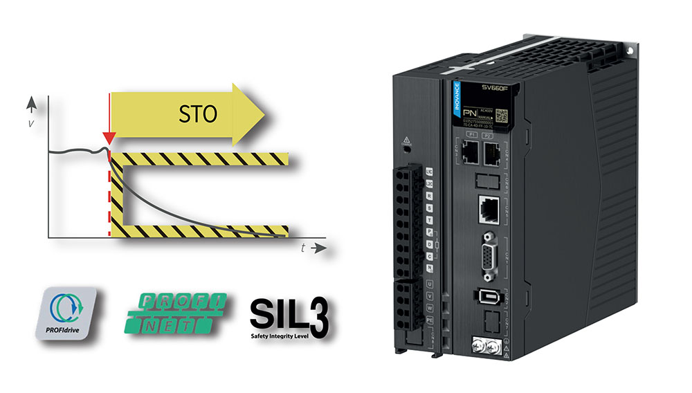 Servo pogon SV660F je skladen s standardom STO (SIL3) po EN/IEC 61800-5-2. Varnostna funkcija STO (“Safe Torque Off”) izklopi napajanje servo motorja in omogoča varno zaustavitev stroja brez dodatnih kontaktorjev.