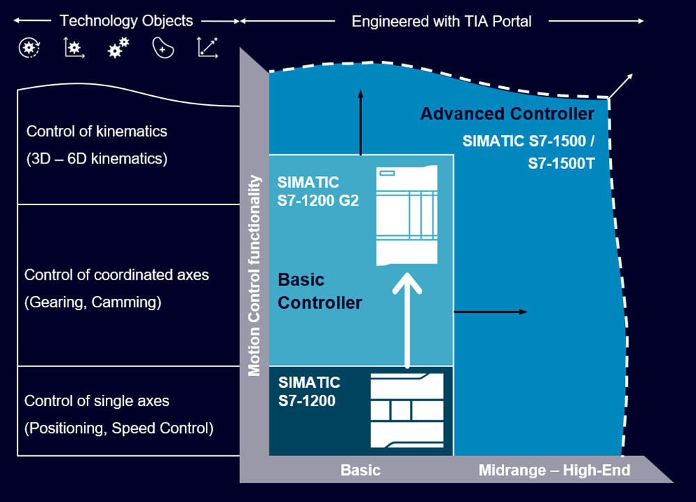 Funkcionalnosti Motion control, ki so bile doslej večinoma domena višjenivojskih krmilnikov, so zdaj v veliki meri integrirane tudi v serijo S7-1200 G2. Z uporabo tehnoloških objektov, ki so znotraj TIA Portala, je konfiguriranje bistveno poenostavljeno. Krmilniki omogočajo enostavno izvajanje nalog od upravljanja posameznih osi do zahtevnejših aplikacij s koordiniranimi osmi in osnovno kinematiko.
