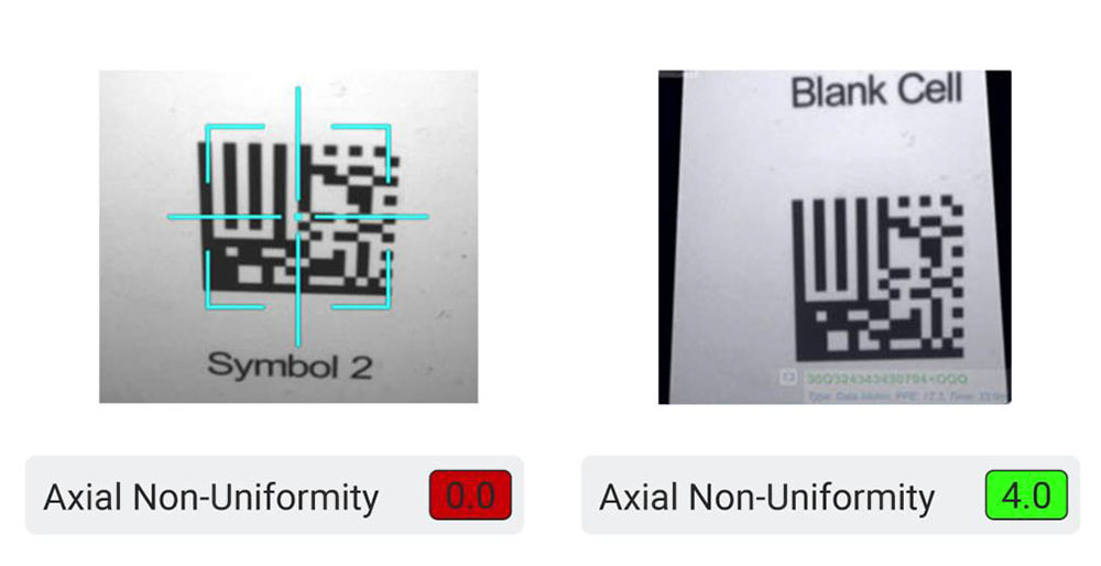 Aksialna neenakomernost je ključni parameter ocenjevanja za 2D kode, kot je Data Matrix, ki meri, kako enakomerno so moduli razporejeni, in če kodo gledamo pod kotom, lahko ta razmik popačimo in znižamo oceno. Z uporabo unwarp transformacije se popačenje mreže popravi tako, da odraža pravo obliko kode, aksialno neenakomerno gradiranje postane natančnejše in preprečuje lažne napake, preverjanje pa ostaja zanesljivo pri ukrivljenih ali poševnih kodah, kar je še posebej dragoceno v aplikacijah z omejenim prostorom v farmacevtski industriji, industriji medicinskih pripomočkih in elektronski industriji, kjer se uporablja nagnjena koaksialna osvetlitev.