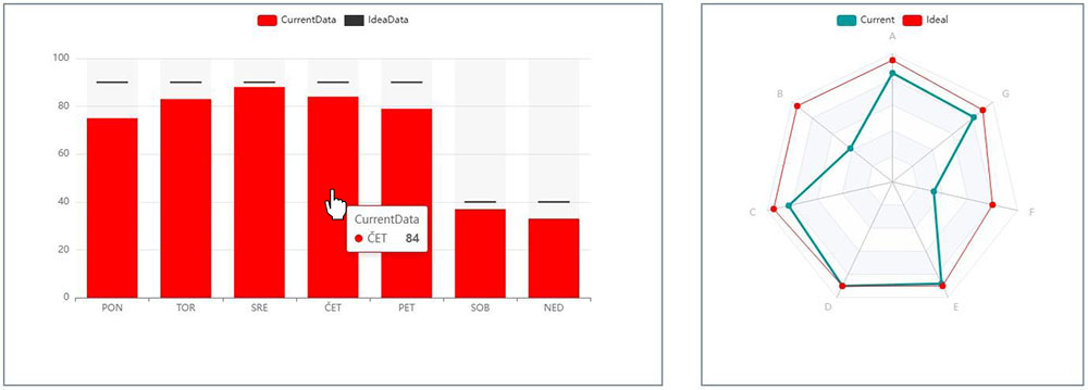 Kot prvi primer sta podana dva različna diagrama za prikaz podatkov, ki ju vidimo na sliki 1. Diagram na levi strani slike je bil razvit za potrebe kupca po dnevnem prikazu porabe različnih energentov. Kontrolo ali v tem primeru stolpični grafikon, je možno v TIA Portalu dodatno urediti. Spremeni se lahko barvo prikaza, število stolpcev in tudi tip diagrama (stolpični ali črtni diagram). Da imamo možnost urejanja kontrole v TIA Portalu mora biti le-ta ustrezno pripravljena.
