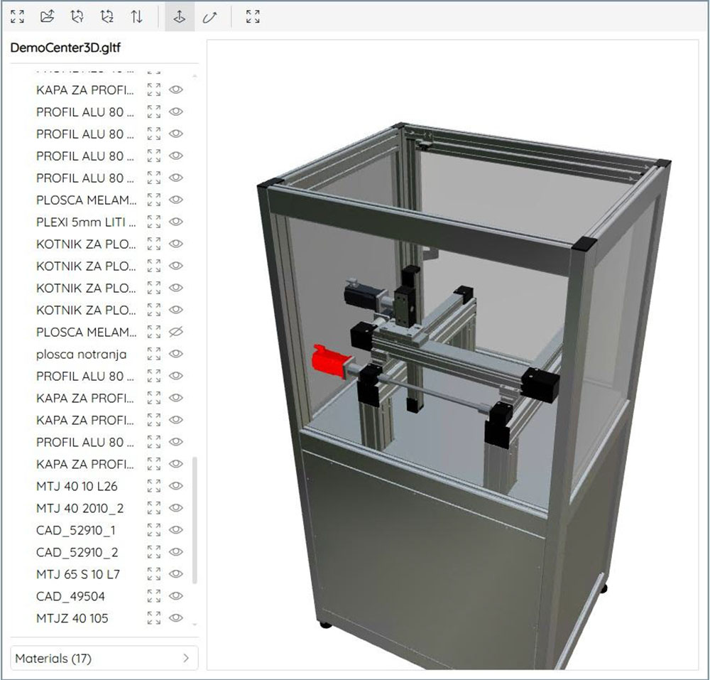 Drugi primer CWC kontrole je prikaz dinamičnih 3D modelov – slika 2. Kontrola omogoča prikaz modelov različnih formatov. Gre se za integracijo three.js knjižnice v WinCC Unified sistem. Vsak posamezni gradnik (‚mesh‘) je možno povezati s spremenljivkami Runtime sistema, kar omogoča dinamični prikaz 3D modela. Kot je razvidno na sliki 2, je možno gradnikom prilagoditi barvo, kar je uporabno za prikaz statusa delovanja. Možno je tudi premikati gradnike po oseh ali sprožiti določeno akcijo ob kliku na gradnik. Na primer, ob kliku na motor, se odpre pojavno okno s podatki dotičnega motorja. Seveda je možno model poljubno rotirati, spremeniti zorni kot pogleda, približati posamezni gradnik ali ga skriti. Uporabniki oz. vzdrževalci tako hitro dobijo informacijo kateremu elementu naprave je potrebno posvetiti pozornost, saj imajo v Runtime sistemu praktično digitalnega dvojčka svoje fizične naprave.